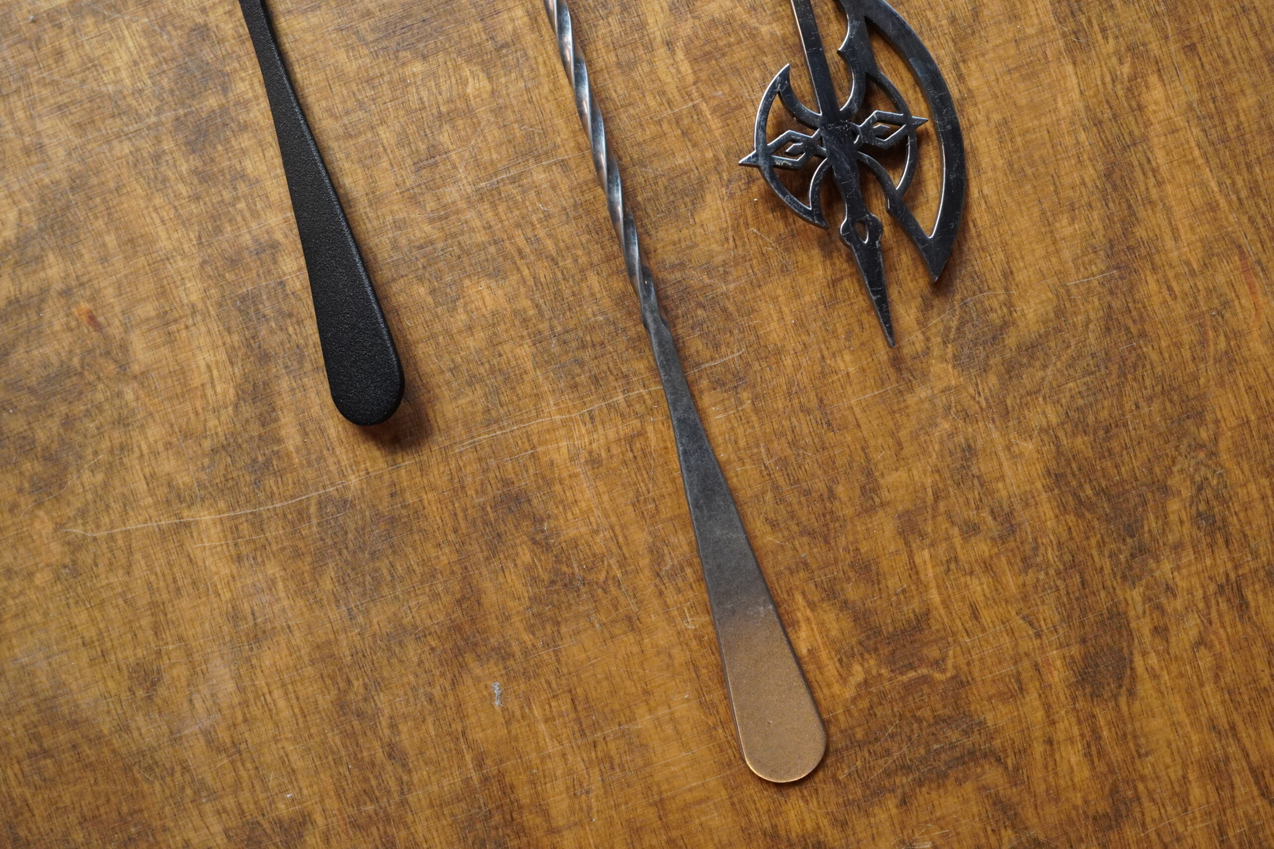 Look rétro, finition travaillée, tige torsadée longue. Trident fin, bonne prise en main, parfait pour les bars qui aiment les outils avec du style. À 45 cm, il offre une belle amplitude pour les verres hauts et les shakers.